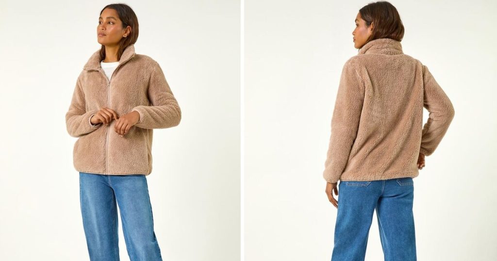 The jacket is made from 100% polyester sherpa fleece, giving it a fluffy, soft texture that feels gentle against the skin. It’s lightweight, making it easy to layer under coats on colder days, or wear on its own during milder spells. Reviewers on retailers like Very describe it as “a lovely jacket that gives me warmth whenever I need it”.