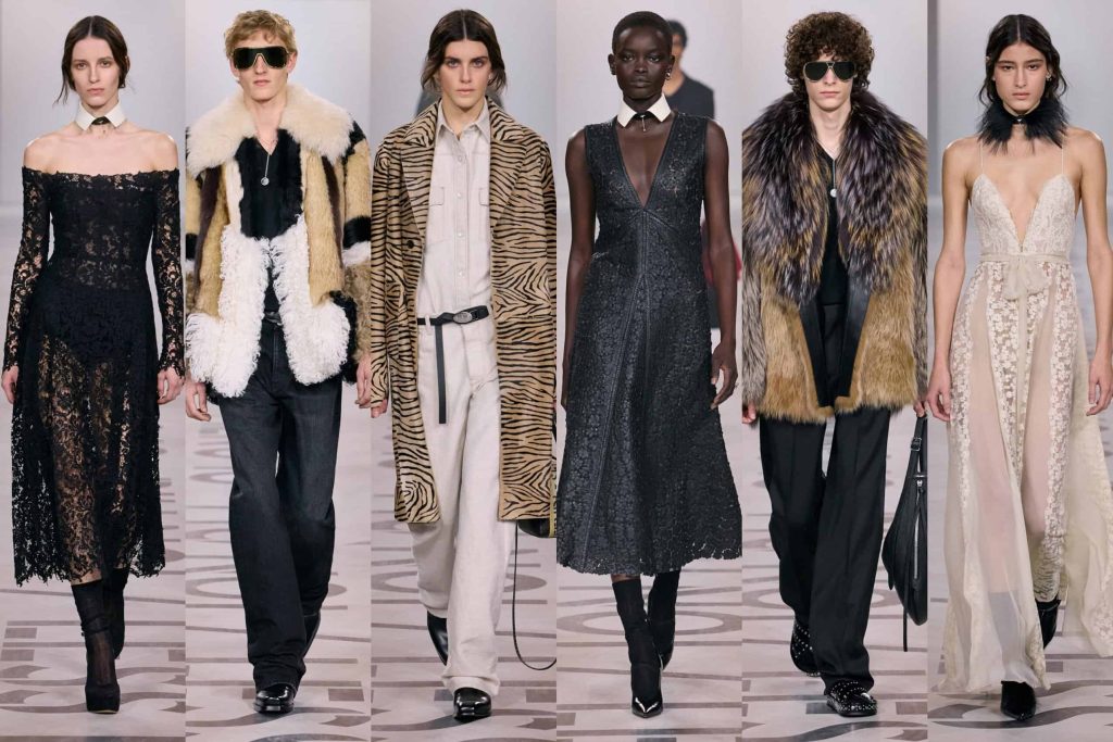 “The co-ed collection, designed by the women’s and men’s design teams, featured many of Chiuri’s codes, recognizable from her time at Dior. Those included long ballet skirts, plenty of black lace, and laser-cut leather, albeit with a sexier Roman edge.”